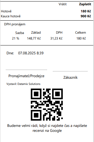 QR kód si nastavíte snadno a jednorázově v administraci Datamix Rent. Poté se bude automaticky tisknout na každou účtenku.